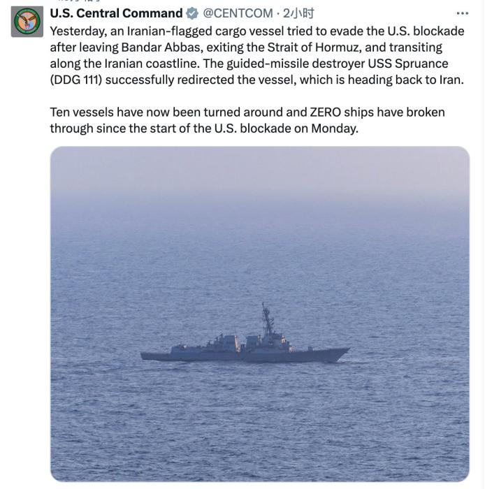 美軍中央司令部表示,自13日美軍開(kāi)始實(shí)施封鎖以來(lái),已有10艘船只被勒令返航,尚無(wú)船只突破封鎖。