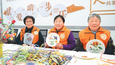 馬玉梅(左)等老年志愿者展示準(zhǔn)備捐獻(xiàn)的手工藝品。 李 樂攝