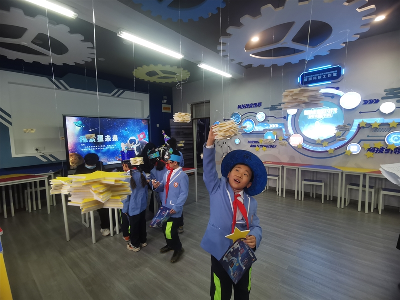 為進(jìn)一步減輕學(xué)生的課業(yè)負(fù)擔(dān),更好地促進(jìn)學(xué)生們的全面發(fā)展,該校變“常規(guī)考試”為“學(xué)科素養(yǎng)考核”,學(xué)業(yè)評價借助“天宮之旅”項(xiàng)目式研學(xué)的形式進(jìn)行,圍繞語文、數(shù)學(xué)、英語、體育、音樂、科學(xué)、美術(shù)七門學(xué)科,分一、二年級設(shè)置了“天宮生活艙”“探索星未來”“星球?qū)ε觥薄疤占佑驼尽钡取瓣P(guān)卡”,學(xué)生們通過“闖關(guān)”既鞏固了知識,又提高了學(xué)習(xí)興趣。