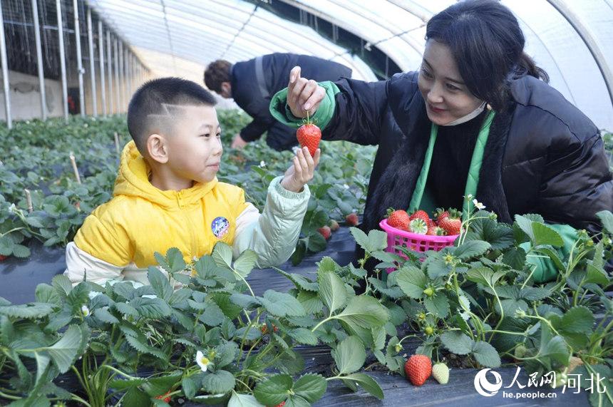 游客在遷安市扣莊鎮(zhèn)蘭若院村果蔬大棚采摘園采摘草莓。 商立超攝