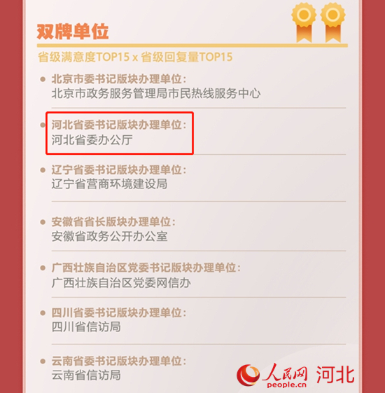 2021年,河北省委書記、省長留言版塊辦理單位雙雙入圍“2021年度人民網(wǎng)網(wǎng)上群眾工作民心匯聚單位”省級滿意度top15榜單。