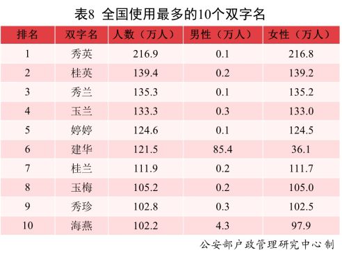 全國(guó)戶(hù)籍人口中,使用頻率最高的10個(gè)雙字名依次為:秀英、桂英、秀蘭、玉蘭、婷婷、建華、桂蘭、玉梅、秀珍、海燕。其中“秀英”名列榜首,使用人數(shù)為216.9萬(wàn)。