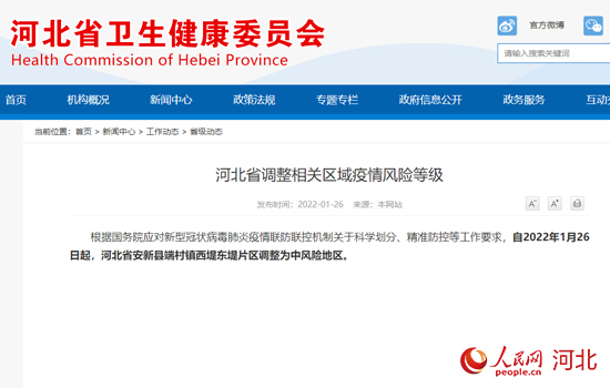 人民網(wǎng)石家莊1月26日電 據(jù)河北省衛(wèi)健委官方網(wǎng)站消息,根據(jù)國務(wù)院應(yīng)對新型冠狀病毒肺炎疫情聯(lián)防聯(lián)控機制關(guān)于科學劃分、精準防控等工作要求,自2022年1月26日起,河北省安新縣端村鎮(zhèn)西堤東堤片區(qū)調(diào)整為中風險地區(qū)。