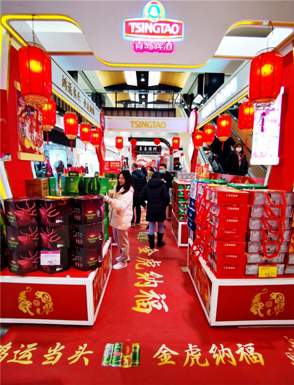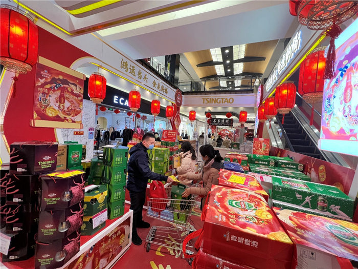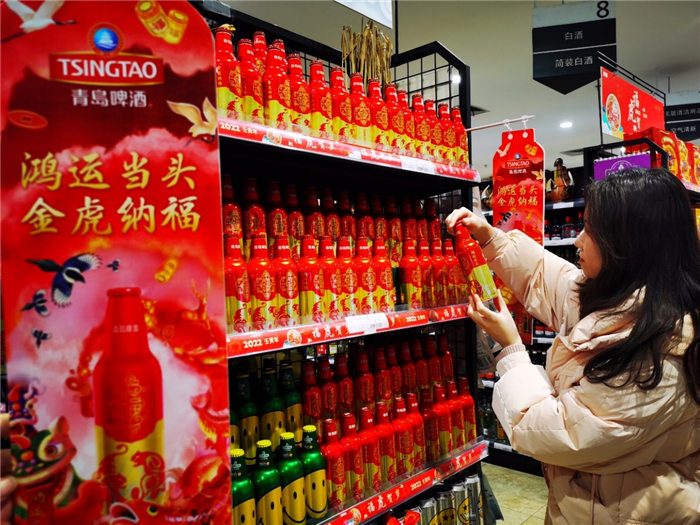 年味不僅是物質(zhì)上的豐富,也有文化上的追求。“過年就買‘鴻運當頭’,圖個好彩頭?!毕M者王先生每年過年都會“鴻運當頭,先囤一波”,作為年夜飯的“必選項”?!澳暌癸埍仨毤t紅火火,不管是名字還是包裝,鴻運當頭就是喜慶,而且酒也好喝,每年還出不同的生肖版,我都收藏著著呢?!痹S多消費者表示,這款青島啤酒成為春節(jié)當之無愧的“鴻運”年貨,走親訪友拎上一提,年味就出來了。