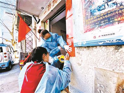 看丹街道工作人員為封控、管控區(qū)的小區(qū)居民貼春聯(lián) 供圖/豐臺區(qū)政府
