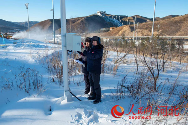 廊坊電力冬奧保障團(tuán)隊李小虎(右)和同事在國家越野滑雪中心賽道上檢查高壓配電室。 鄒明攝