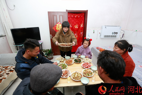 除夕夜,河北灤州灤城街道楊家院村脫貧戶孟德玲一家正在吃年夜飯。李陽攝