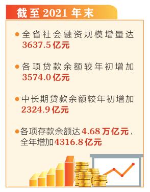 截至2021年末,我省社會(huì)融資規(guī)模存量5.11萬(wàn)億元,全年社會(huì)融資規(guī)模增量達(dá)3637.5億元。從各項(xiàng)貸款來(lái)看,截至2021年末,全省金融機(jī)構(gòu)本外幣各項(xiàng)貸款余額3.42萬(wàn)億元,較年初增加3574.0億元,同比多增1052.5億元,增量創(chuàng)下新高。