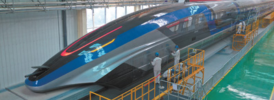 在位于山東青島的中車四方股份有限公司,工作人員對研發(fā)中的高速磁浮列車進(jìn)行調(diào)試。
