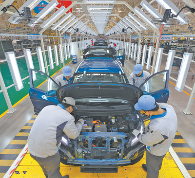 工作人員在山西運(yùn)城一家汽車制造企業(yè)的總裝車間作業(yè)。