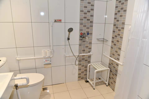酒店前臺(tái)設(shè)置了低位服務(wù)臺(tái),坐著就可以辦理入住登記等手續(xù)。進(jìn)入電梯后,電梯按鈕上附有盲文,方便視力障礙人士使用;鏡面、扶手、語音播報(bào)一應(yīng)俱全。來到客房部,走廊平整開闊,鋪設(shè)了防滑地膠,客房的房門也進(jìn)行了拓寬。進(jìn)入客房內(nèi),低位開關(guān)、無障礙寫字桌、開放式衣柜等,讓人感覺溫暖、舒適。衛(wèi)生間里配備了各類無障礙設(shè)施,淋浴區(qū)一側(cè)的墻壁上裝有無障礙扶手,并配備了無障礙淋浴椅和寬大的浴室鏡等。低位洗手盆旁邊,是低位置物架,上面放著擦手巾。