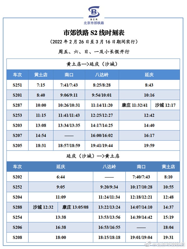 人民網(wǎng)北京2月25日電 據(jù)北京市郊鐵路官方微博消息,根據(jù)鐵路運(yùn)輸調(diào)整通知,2022年2月26日至3月16日, S2線恢復(fù)周二、三、四3對/日,周五、六、日、一及小長假7對/日的列車開行方案,列車開行時(shí)點(diǎn)無變化,具體列車時(shí)刻表如下所示。