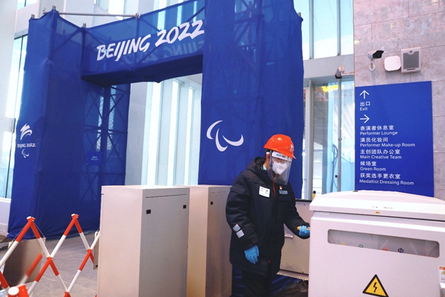 國網(wǎng)北京頒獎廣場電力保障團(tuán)隊成員在延慶冬殘奧頒獎廣場巡視舞臺區(qū)設(shè)備,確保頒獎儀式供電可靠。張博寧攝
