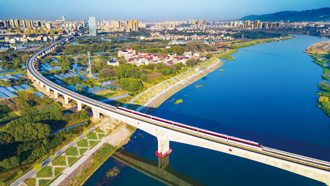 3月12日早晨,金華金義東市域軌道交通一列電客車疾馳而過(guò),穿過(guò)金東區(qū)跨東陽(yáng)江大橋,駛向下一站——金華南站,河道兩岸,綠油油的田野、遠(yuǎn)處林立的高樓連片交織,組成一幅春天絢麗多彩的圖畫。(時(shí)寬兵)