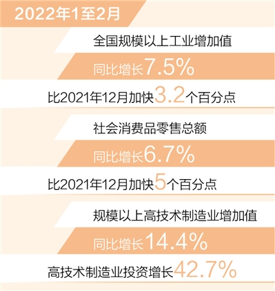 工業(yè)、服務業(yè)逐步回升。1至2月,全國規(guī)模以上工業(yè)增加值同比增長7.5%,比2021年12月加快3.2個百分點,41個大類行業(yè)中超過九成行業(yè)實現(xiàn)增長;全國服務業(yè)生產指數(shù)同比增長4.2%,比2021年12月加快1.2個百分點。
