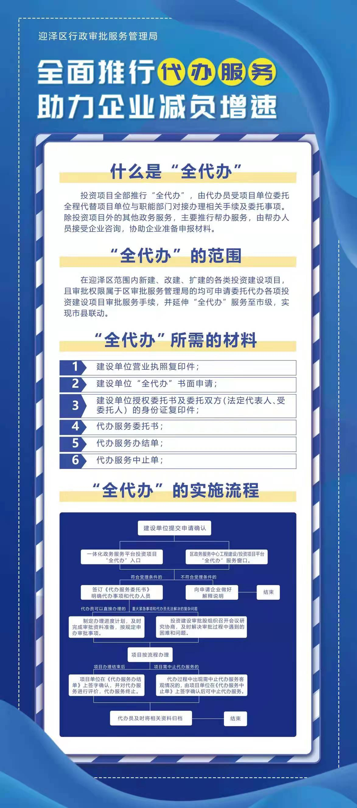 據(jù)介紹,針對項目審批手續(xù)多、時限長等問題,太原市迎澤區(qū)行政審批局梳理堵點(diǎn)痛點(diǎn),實施流程再造,開展了投資項目建設(shè)“全代辦”服務(wù),按照“合法高效、自愿委托、無償服務(wù)、全程跟蹤、協(xié)同聯(lián)動”的原則,為企業(yè)提供委托項目一部門辦、一窗入件、一人代跑、一律免費(fèi)的“全代辦”服務(wù)。