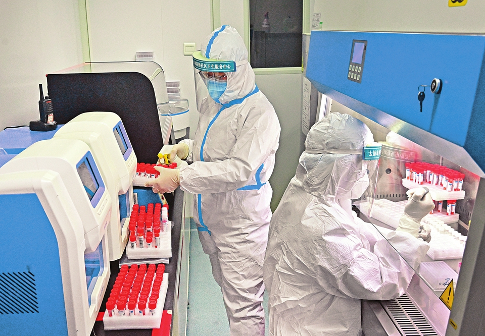 在太原市杏花嶺區(qū)壩陵橋社區(qū)衛(wèi)生服務(wù)中心PCR室,醫(yī)務(wù)人員正在對(duì)采集樣本進(jìn)行新型冠狀病毒核酸檢測(cè)。 記者劉通攝