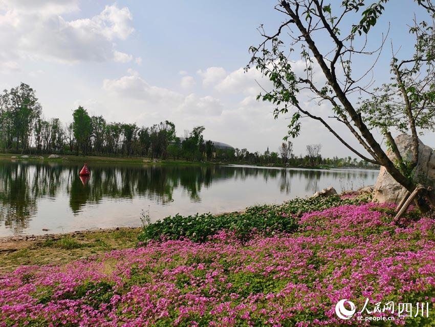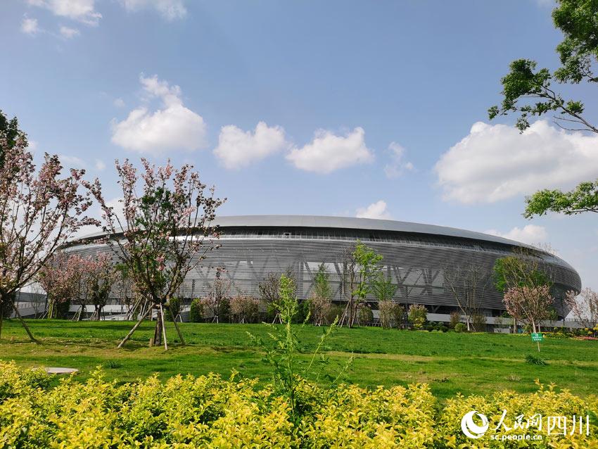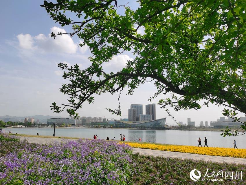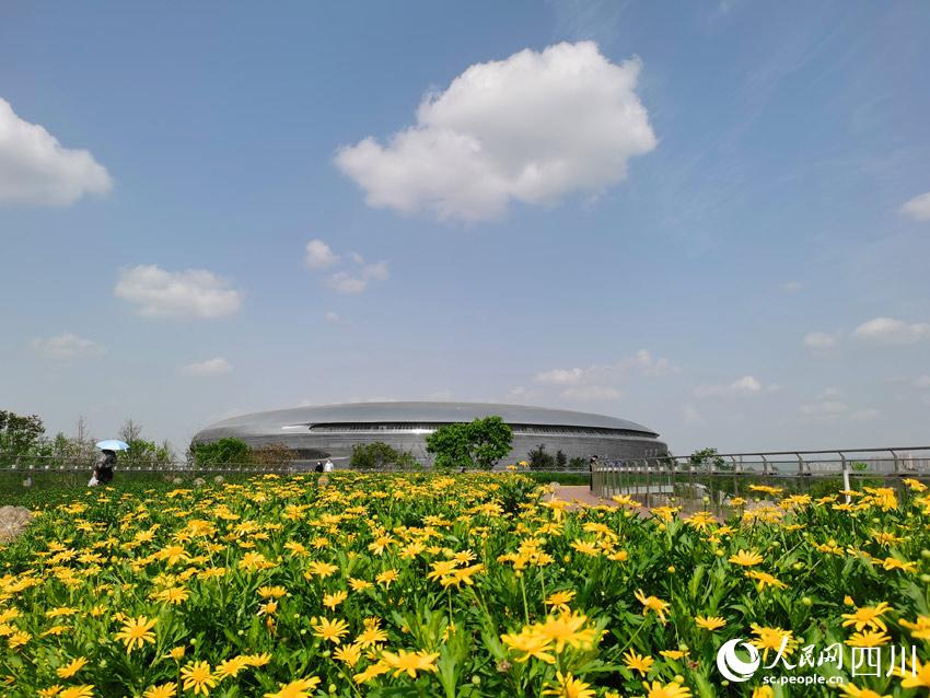 龍泉山脈綿亙遠方,東安湖水蕩漾眼底,體育場館巍峨半空,花草樹木各展春姿。在湖光山色之間,有大量市民前來踏青賞春,順便欣賞著大運會場館和火炬塔的風(fēng)采。