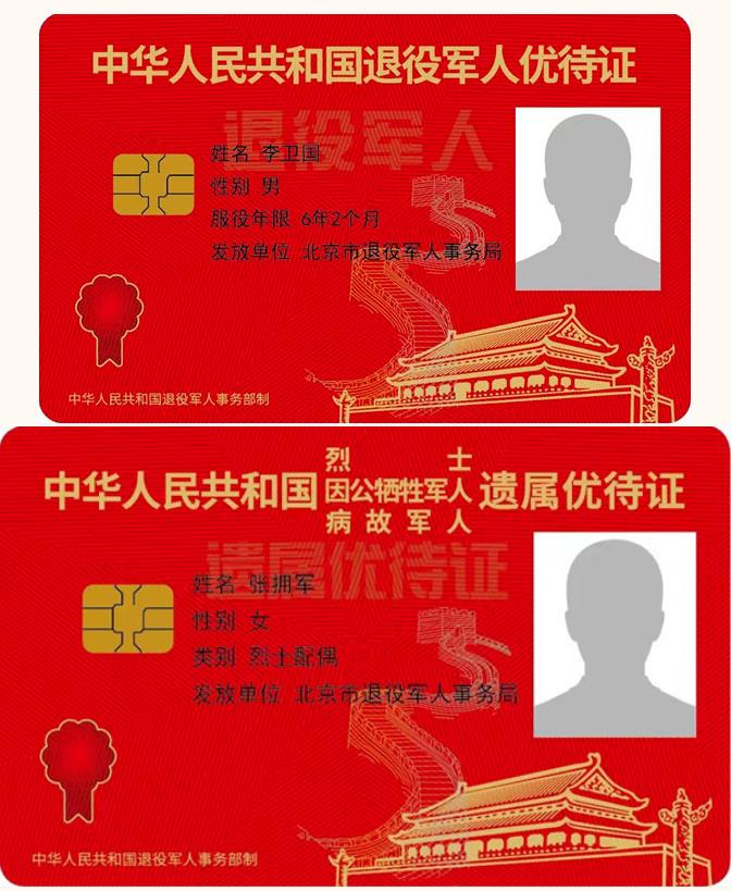據(jù)介紹,優(yōu)待證以紅色為基調(diào),正面印有優(yōu)待證種類名稱,持證人基本信息、相片等。背面印有制證銀行名稱、銀行卡號等信息。優(yōu)待證分為“中華人民共和國退役軍人優(yōu)待證”“中華人民共和國烈士、因公犧牲軍人、病故軍人遺屬優(yōu)待證”兩種,分別面向符合條件的退役軍人和烈士遺屬、因公犧牲軍人遺屬、病故軍人遺屬等其他優(yōu)撫對象免費發(fā)放,是持證人彰顯榮譽的載體、享受優(yōu)待的憑證。