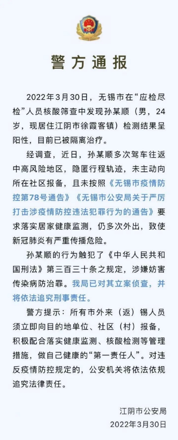 通報稱,3月30日,無錫市在“應(yīng)檢盡檢”人員核酸篩查中發(fā)現(xiàn)孫某順(男,24歲,現(xiàn)居住江陰市徐霞客鎮(zhèn))檢測結(jié)果呈陽性,目前已被隔離治療。