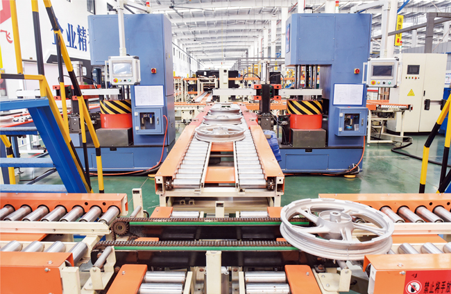 3月30日,在位于金華婺城區(qū)摩輪未來(lái)工廠生產(chǎn)車(chē)間里,智能生產(chǎn)線正在平穩(wěn)運(yùn)行,全自動(dòng)完成設(shè)定的輪轂加工工序。該工廠被金華市和婺城區(qū)列為數(shù)字化示范企業(yè)。企業(yè)運(yùn)用5G、視覺(jué)識(shí)別等新一代信息技術(shù),大量應(yīng)用工業(yè)機(jī)器人,實(shí)現(xiàn)柔性化生產(chǎn),建成裝備數(shù)字化、工藝數(shù)字化、運(yùn)營(yíng)數(shù)字化的數(shù)字化工廠。用工人數(shù)比傳統(tǒng)項(xiàng)目減少58%,生產(chǎn)效率提升15%。(陳俊、李建林)