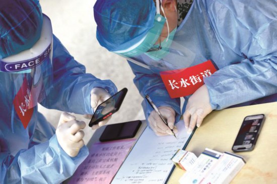 3月31日,嘉興經(jīng)開區(qū)城南街道良秀社區(qū)元一柏莊內(nèi)的兩個點位上,工作人員通知居民排隊有序登記需求藥品并盡可能幫忙購買,滿足管控區(qū)居民日常需求。(王蓉)