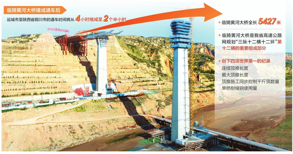 臨猗黃河大橋是連接晉陜最長的黃河公路大橋,全長5427米,主橋采用等高度連續(xù)鋼箱組合梁,從山西、陜西兩處頂推平臺(tái)對向頂推,這也創(chuàng)下連續(xù)頂推長度、最大頂推長度、頂推施工同步控制千斤頂數(shù)量以及單橋耐候鋼使用量四項(xiàng)世界第一的紀(jì)錄。