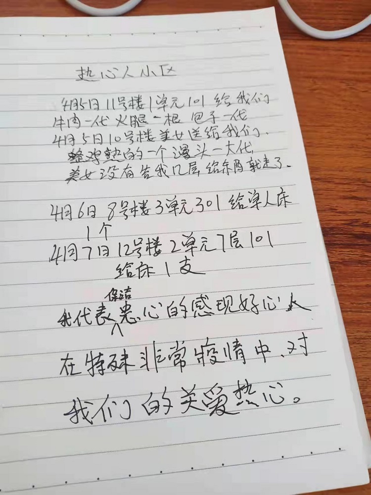 “4月5日,11號(hào)樓1單元101,給我們牛肉一袋,火腿一根,包子一袋;4月5日,10號(hào)樓送來整雞一個(gè),饅頭一大袋,但是沒有留下具體門牌就走了;4月6日,8號(hào)樓3單元301給單人床一個(gè);4月7日,12號(hào)樓2單元7層101給床一個(gè)。我代表保潔衷心地感謝好心人,在非常時(shí)期,對(duì)我們的關(guān)愛。”