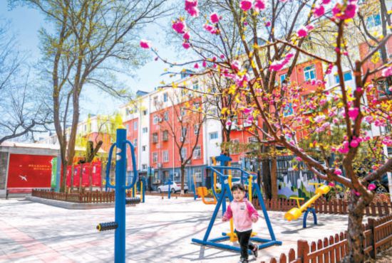 大興區(qū)興豐街道老小區(qū)黃村西里社區(qū)在居民的共同維護(hù)下,居住環(huán)境整潔舒適。圖為提升后的社區(qū)廣場上,小朋友正在樂享春光。本報(bào)記者 武亦彬攝