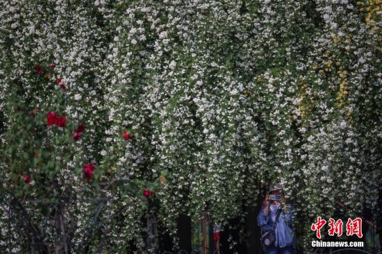 4月11日,南京玄武湖畔木香花盛放,團(tuán)團(tuán)簇簇的花朵從高處“傾瀉”而下猶如“瀑布”。圖為市民在木香花下拍照。 中新社記者 泱波 攝