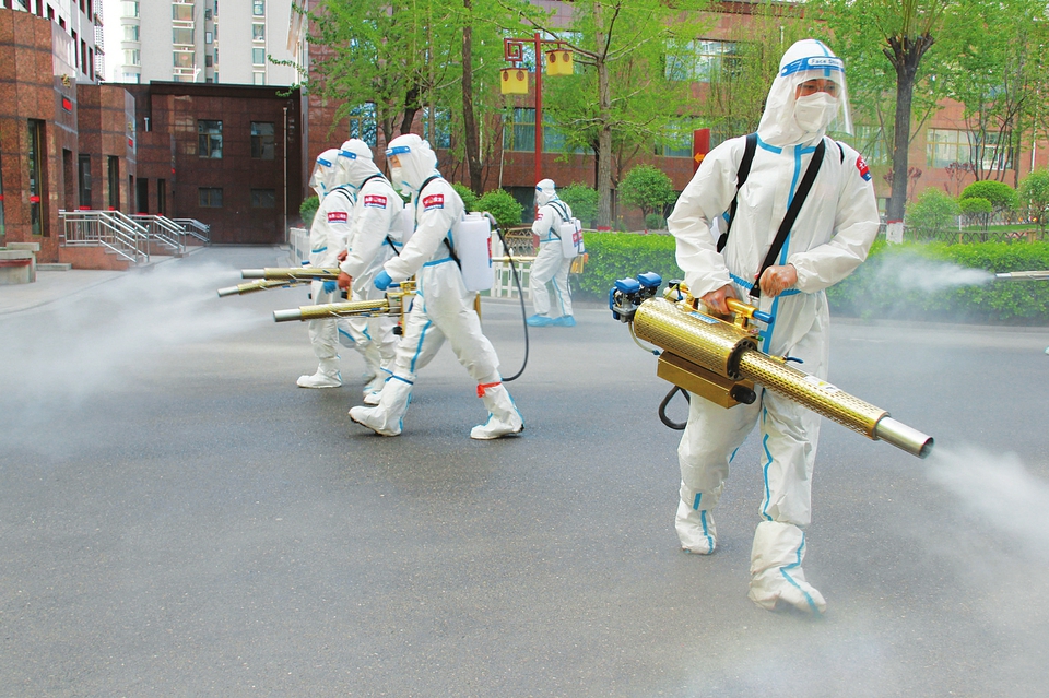 4月12日,在小店區(qū)千禧學(xué)府苑小區(qū),太原市應(yīng)急管理綜合行政執(zhí)法支隊(duì)的消殺隊(duì)員們正在消殺。隨后他們來到西吳村社區(qū)、丁香園、恒大綠洲、長(zhǎng)風(fēng)小區(qū)等居民住宅區(qū),對(duì)所有樓棟、垃圾點(diǎn)及室外公共區(qū)域等進(jìn)行全面消殺,牢牢筑起健康防線。(記者尤麗云攝)