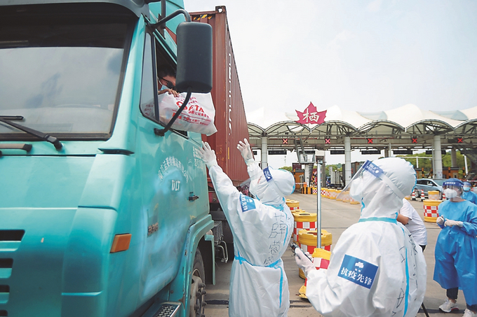 以“同心抗疫 我們在行動”為主題的貨車司機(jī)關(guān)愛活動最近在我省多地開展,志愿者們?yōu)樨涇囁緳C(jī)送去“抗疫愛心包”,提供暖心服務(wù)。圖為20日,在南京繞城高速棲霞收費站出口,志愿者向貨車司機(jī)送上“抗疫愛心包”。本報記者 陳儼 攝