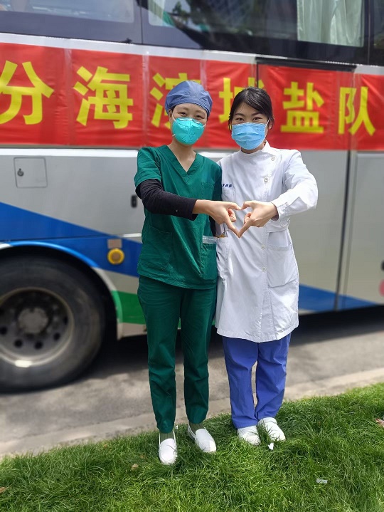 梁慧和姜蕾蕾一樣,在江蘇省鹽城市濱海縣第一人民醫(yī)院腦外科任職護(hù)士。作為一名擁有8年黨齡的老黨員,在得知上海需要支援時(shí),她毫不猶豫地在單位報(bào)名加入了江蘇省援滬醫(yī)療隊(duì)鹽城濱海分隊(duì)?!拔抑辣砻靡言谝痪€日夜奮戰(zhàn)了一個(gè)多月了,這一次,我們姐妹倆也算是一起并肩作戰(zhàn)了”,梁慧笑著說道。