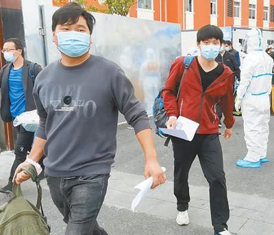 一個(gè)小時(shí)后,大巴停在閔行區(qū)浦江鎮(zhèn)談連方艙醫(yī)院門(mén)口。200多名康復(fù)者背著大包小包,已經(jīng)在院子里排隊(duì),經(jīng)工作人員指引依次登記出艙。