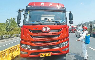 4月21日,郭輝駕駛貨車(chē)返回南京后,防疫工作人員對(duì)貨車(chē)進(jìn)行消毒。本報(bào)記者 姚雪青攝