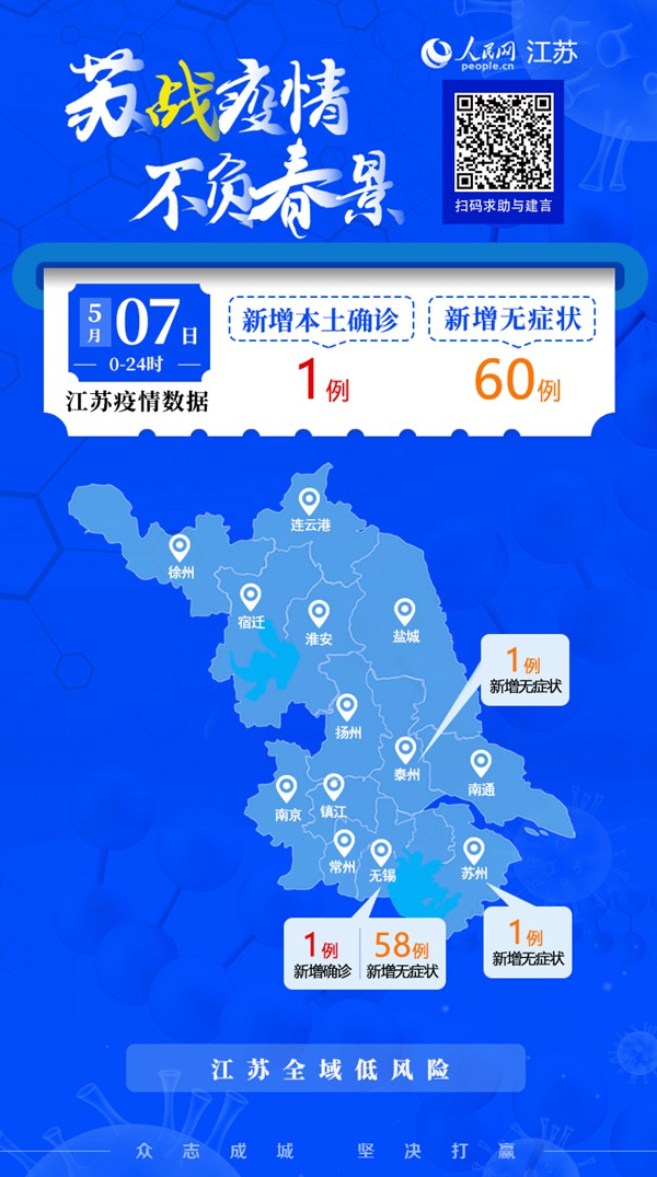 - 5月7日江蘇新增1例本土確診病例 60例本土無(wú)癥狀感染者
