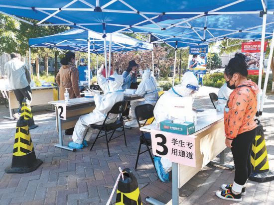 昨天,石景山區(qū)古城街道燕堤中街社區(qū)核酸檢測(cè)點(diǎn)設(shè)有學(xué)生檢測(cè)專用通道,方便學(xué)生隨來(lái)隨檢,不耽誤上網(wǎng)課。本報(bào)記者 吳鏑攝