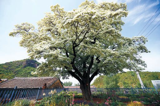 本報訊(記者 王可心)日前,密云區(qū)新城子鎮(zhèn)蘇家峪村一株古流蘇樹進入盛花期,作為北京市屈指可數(shù)的古流蘇樹,不僅因花枝觀賞性強受到民眾喜愛,更因其歷史價值而被廣泛關注。據(jù)了解,流蘇樹系北京市二級保護野生植物?!拔覀兇暹@株流蘇樹是一級古樹,據(jù)專家推斷,至今已有近600年歷史。”蘇家峪村黨支部書記王銀江介紹,該樹高約13米,主干到1.3米處分為兩主枝,向上延展成蘑菇形樹冠,平均冠幅約16米?;ㄆ陂_滿潔白的流蘇花,遠觀如覆霜蓋雪,流蘇細穗隨風搖曳,清香怡人。供圖/密云區(qū)委宣傳部