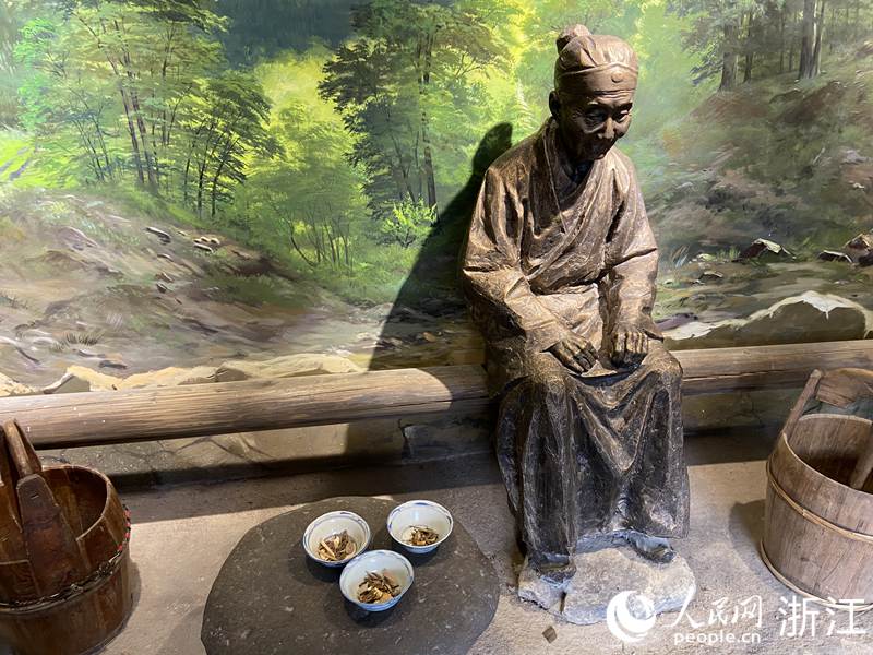 中國(guó)自古有施茶傳統(tǒng),鄉(xiāng)間有三里立茶亭、十里建長(zhǎng)亭施茶,供路人休憩的風(fēng)俗。在茶之俗展廳,記者看到了一比一還原的施茶場(chǎng)景:施茶者坐于亭內(nèi),面前是3碗裝有端午茶的茶碗,等待過(guò)往路人前來(lái)飲用。施茶的習(xí)俗也體現(xiàn)了松陽(yáng)人樂善好施的傳統(tǒng)美德。