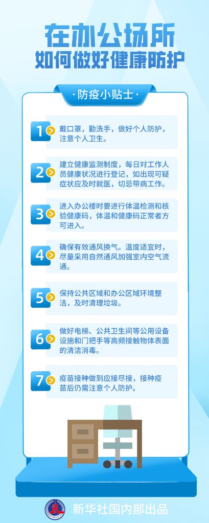 當前,全國日新增本土確診病例和無癥狀感染者數(shù)量繼續(xù)下降,但每日仍有10余個省份報告新增本土感染者,疫情防控形勢依然嚴峻復雜。國家衛(wèi)生健康委疾控局副局長、一級巡視員雷正龍?zhí)崾?,要落實重點場所、重點人群、重點單位防控措施。在辦公場所如何做好健康防護?這份來自國家衛(wèi)生健康委的防護指南請收好。(宋晨、李恒)