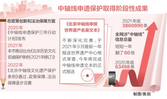 2017年,“積極推進中軸線申遺工作”寫入《北京城市總體規(guī)劃(2016年—2035年)》。同年,北京市推進全國文化中心建設領(lǐng)導小組批準成立了中軸線申遺保護專項工作組,全面啟動北京中軸線申遺保護工作……