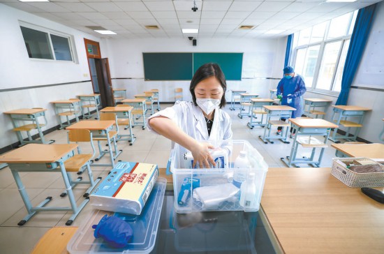 北京東直門中學(xué)考點(diǎn),老師正在展示考場配備的防疫物品箱,箱內(nèi)配備口罩、消毒酒精等防疫物品。 本報記者 潘之望攝