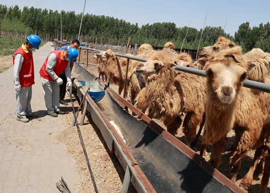 5月31日,國(guó)家電網(wǎng)冀北電力唐山“鋼鐵之魂”共產(chǎn)黨員服務(wù)隊(duì)隊(duì)員來(lái)到駱駝專(zhuān)業(yè)合作社檢查用電設(shè)備。 周宇翔攝
