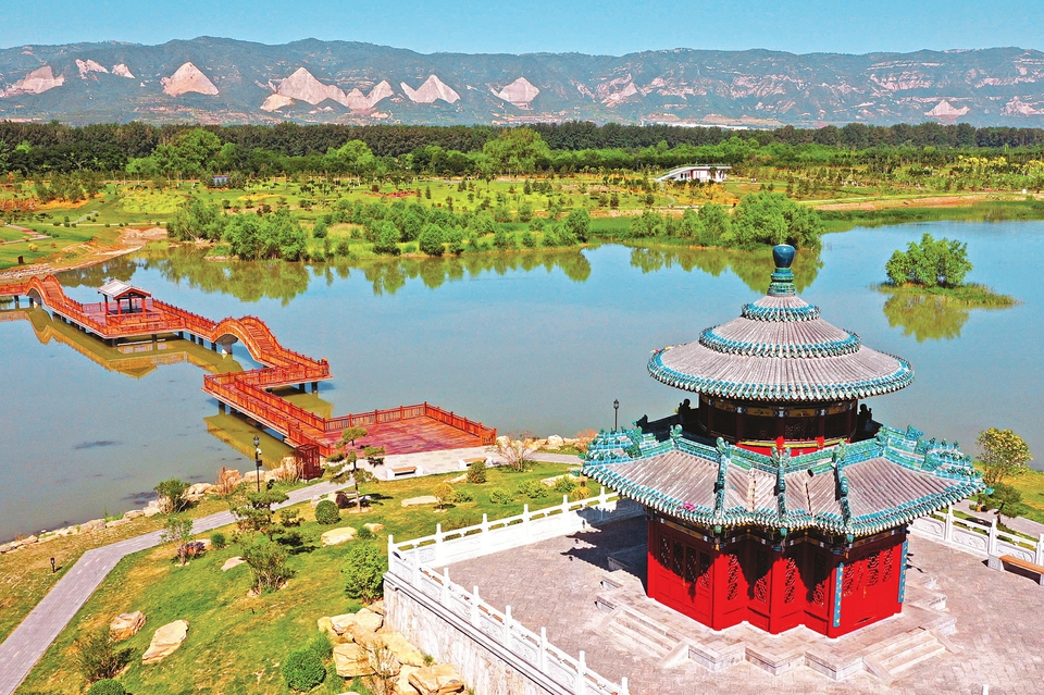 6月13日,在太原汾河景區(qū)四期工程望岳閣畔,一座木結構景觀橋猶如江南水鄉(xiāng)景色,連廊臥波于汾河之上,為長達十公里的汾河四期工程增添了浪漫畫卷。(記者劉通攝)
