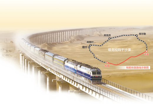 作為國家重點鐵路建設項目,和若鐵路西起新疆和田地區(qū)和田市,東至巴音郭楞蒙古自治州若羌縣,全長825公里,設計時速120公里。和若鐵路開通后,與南疆鐵路、格庫鐵路相連,全長2712公里,形成世界首個沙漠鐵路環(huán)線。