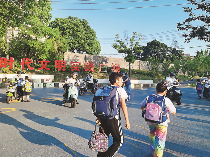 南京市棲霞區(qū)實(shí)驗(yàn)小學(xué)西門前的口袋公園廣場(chǎng)上,孩子們歡笑著跑向父母。 劉玉琴 攝