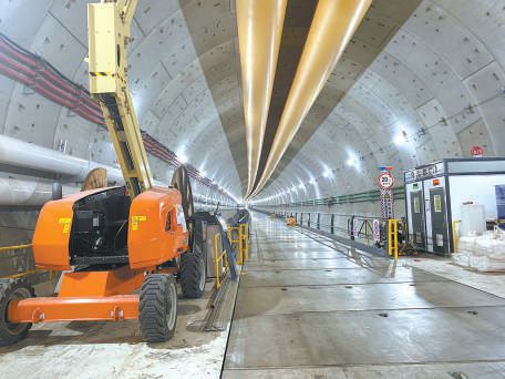 走進(jìn)項(xiàng)目工地,沒有想象中的機(jī)械轟鳴聲,施工現(xiàn)場位于幾十米深的地下。記者從地面乘坐直梯,順著盾構(gòu)機(jī)始發(fā)井,來到地下26米處的西線隧道內(nèi)。國產(chǎn)最大直徑泥水平衡盾構(gòu)機(jī)“京華號”,已在西線隧道里向前掘進(jìn)了近4000米。眼前的西線隧道,蜿蜒著向南延伸。開工初期,記者從始發(fā)井步行幾分鐘即可抵達(dá)盾構(gòu)機(jī)駕駛艙位置;這次采訪,施工方特意安排了1輛純電動(dòng)代步車?!艾F(xiàn)在盾構(gòu)機(jī)離始發(fā)井有些遠(yuǎn),工作人員上下班都得坐車。”駕駛員說,這輛電動(dòng)代步車是用吊車吊到隧道內(nèi)的,還特意為它在隧道里安了充電樁,“這輛車再回到地面,就得是隧道貫通的時(shí)候啦!”