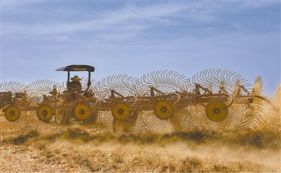 安徽省宿州市碭山縣張王莊村,農(nóng)機(jī)手駕駛摟草機(jī)將小麥秸稈回收打包,用于有機(jī)肥加工、生物質(zhì)發(fā)電、畜牧養(yǎng)殖等。
