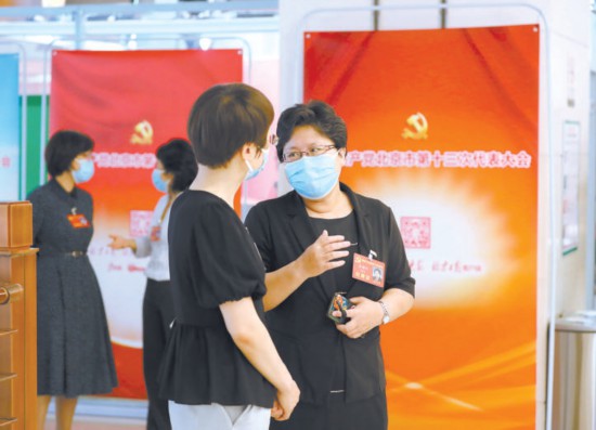 分團討論休息時,教育系統(tǒng)的代表在會議室外繼續(xù)交流。本報記者 賈同軍攝