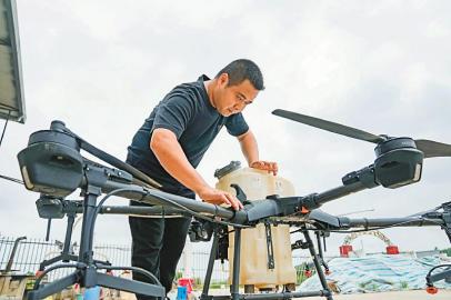中江縣金穗源糧食專業(yè)合作社理事長常滔在做無人機(jī)起飛前的準(zhǔn)備工作。四川日?qǐng)?bào)全媒體記者 李強(qiáng) 攝